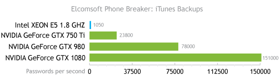 Note: password recovery features are available in Windows version only. GPU AccelerationElcomSoft offers a highly efficient, cost-effective solution to lengthy attacks by dramatically increasing the speed of password recovery when one or more supported video cards are present. The company’s patented GPU acceleration reduces the time required to recover iPhone/iPad/iPod and BlackBerry backup passwords by orders of magnitude. The latest generation of ElcomSoft GPU acceleration technology supports unlimited numbers of AMD or NVIDIA boards such as NVIDIA 600/700/800/900/1000-series and AMD 6000/7000/R5/R7/R9-series. ElcomSoft GPU acceleration provides true supercomputer performance at consumer prices. To make GPU acceleration cost-effective, ElcomSoft implemented support for multiple diverse GPU acceleration units running at the same time. Effectively, this budget-friendly solution allows mixing multiple generations of compatible video cards, extending existing systems by adding new acceleration hardware instead of replacing.