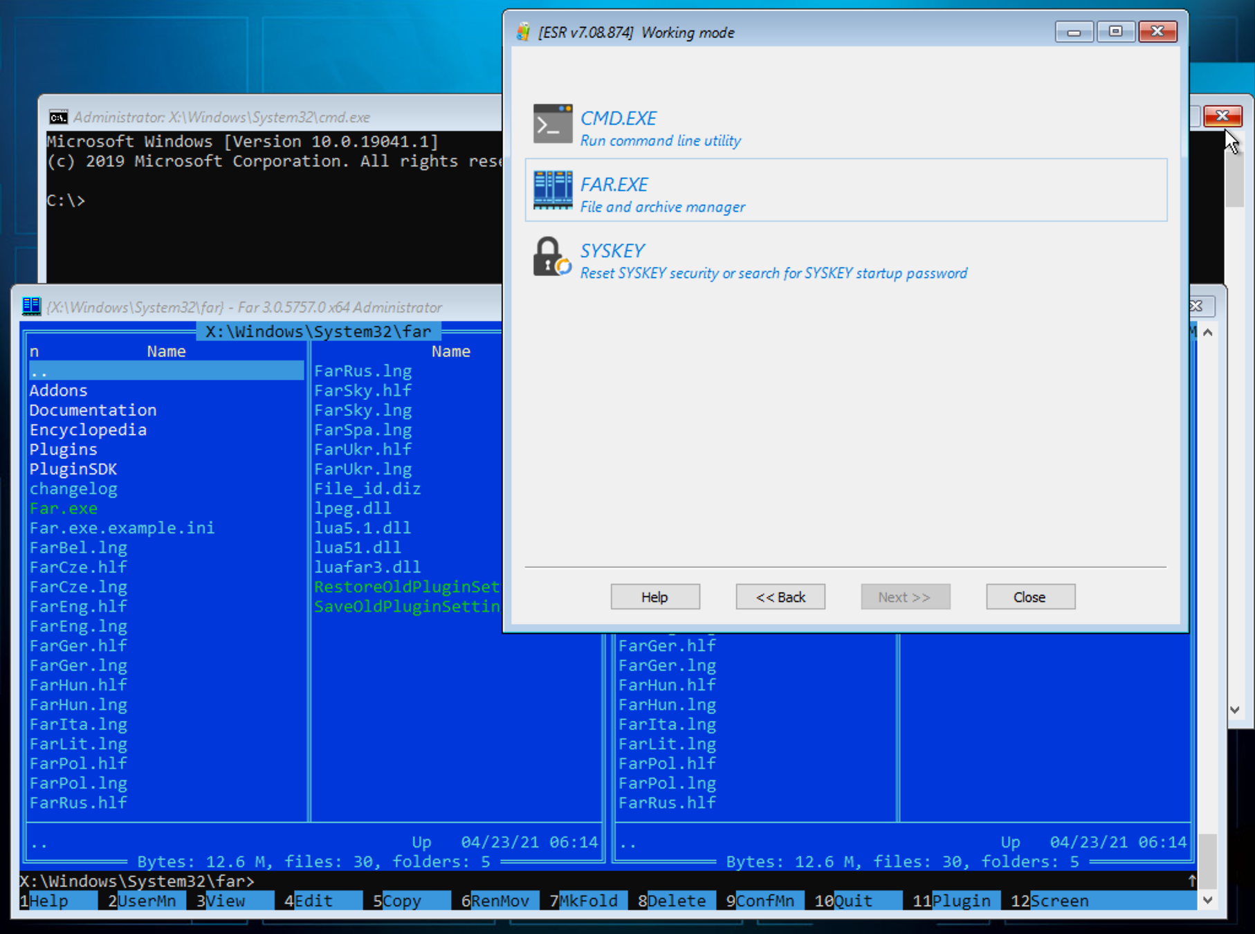 •CMD.EXE - the command line. You can use it to perform additional operations like copying files or launching built-in WinPE tools. •FAR Manager - light and convenient file manager to explore the file system. •SYSKEY - allows resetting or recovering the Syskey startup password.